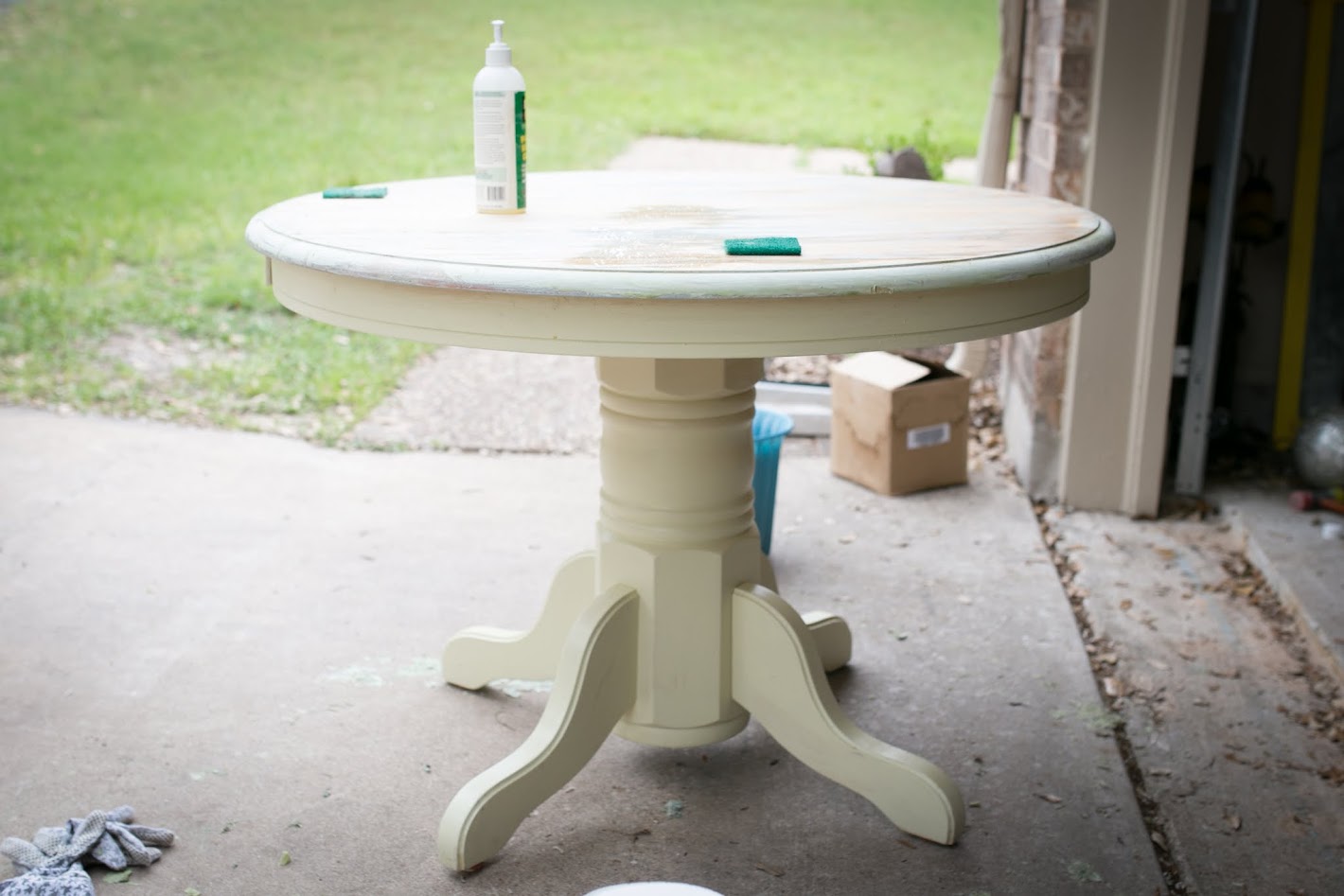 | Here is the table I procured on craigslist to refinish for our current kitchen. This photo was taken after I had begun removing the paint. |